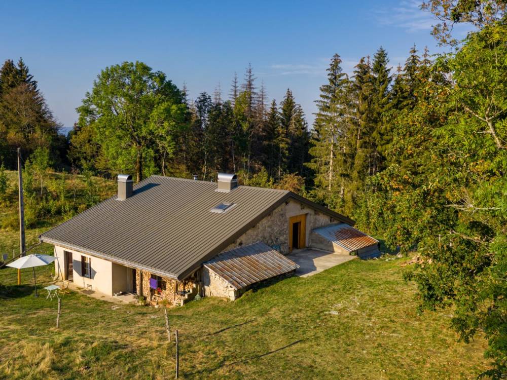 Appartement spacieux de 90m² situé en pleine nature dans une ancienne ferme d’estive, environnement de pâturages et forêt, aménagement sobre et soigné, belle ambiance bois. Les roches d’Orvaz, site naturel d’exception aux confins de l’Ain et du Haut-Jura.