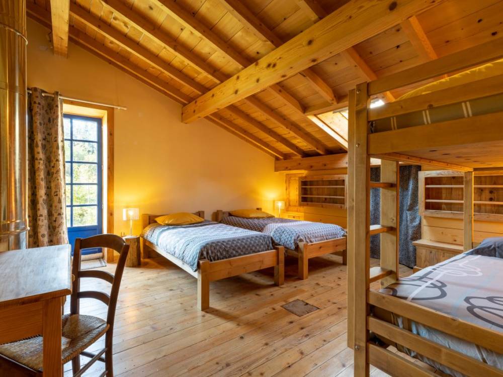 Au niveau de la grange : local pour le bois ainsi que pour vélos et skis. Entrée du gîte vers les chambres : 1 petite chambre double + une grande chambre pour 4 personnes avec dressing.