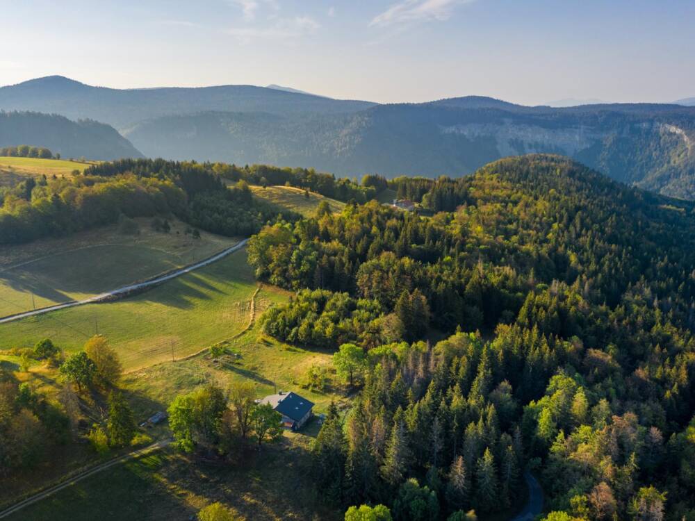 Les Roches d’Orvaz – 1160 m – aux confins de l’Ain et du Haut-Jura sur un petit plateau très protégé, à droite de la départementale qui joint le croisement de Désertin au village de La Pesse.