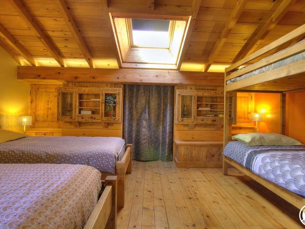 Au niveau de la grange : local pour le bois ainsi que pour vélos et skis. Entrée du gîte vers les chambres : 1 petite chambre double + une grande chambre pour 4 personnes avec dressing.
