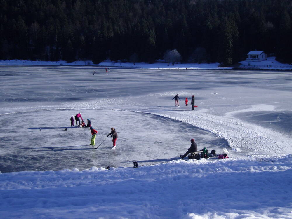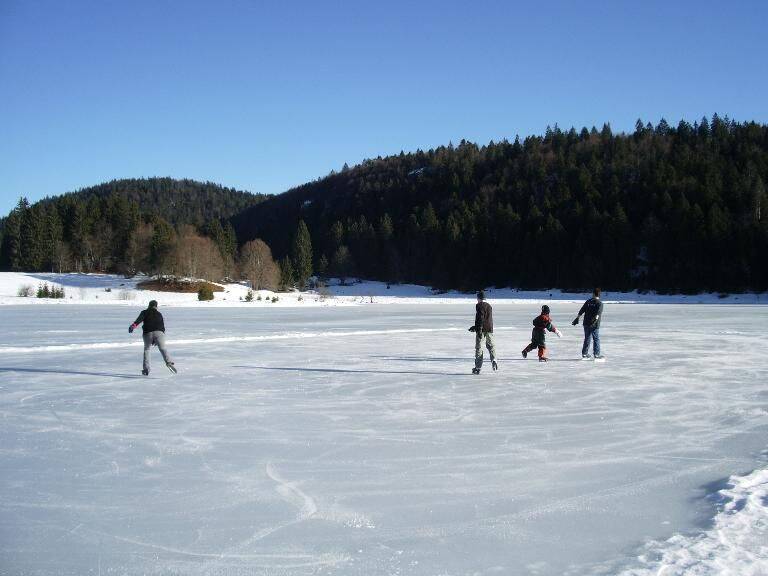 Lorsque la température extérieure baisse et qu'une couche de glace épaisse (minimum 13 cm) recouvre le lac Genin, ce dernier se transforme en vaste patinoire naturelle. Chaussez vos patins !