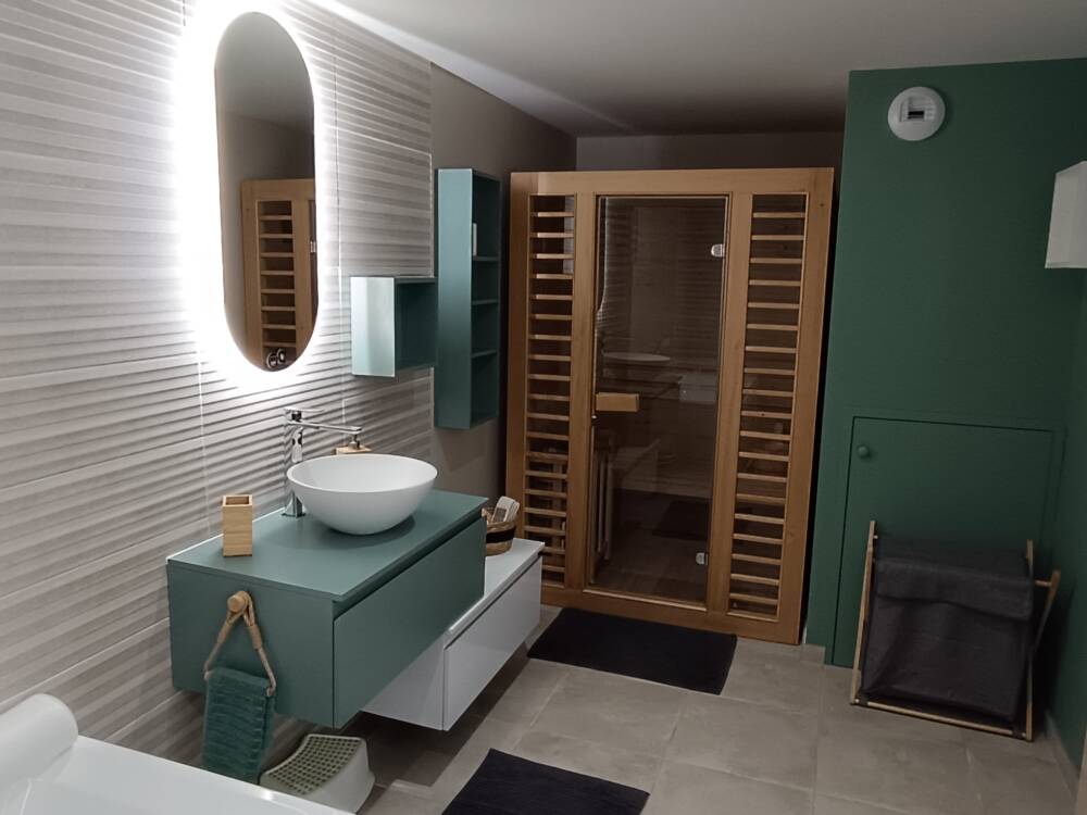 3 chambres dont une suite parentale, grande salle de bain avec balnéo et sauna. Salon avec poêle à bois, cuisine US. Chauffage au sol et jardin 200 m2 BBQ,