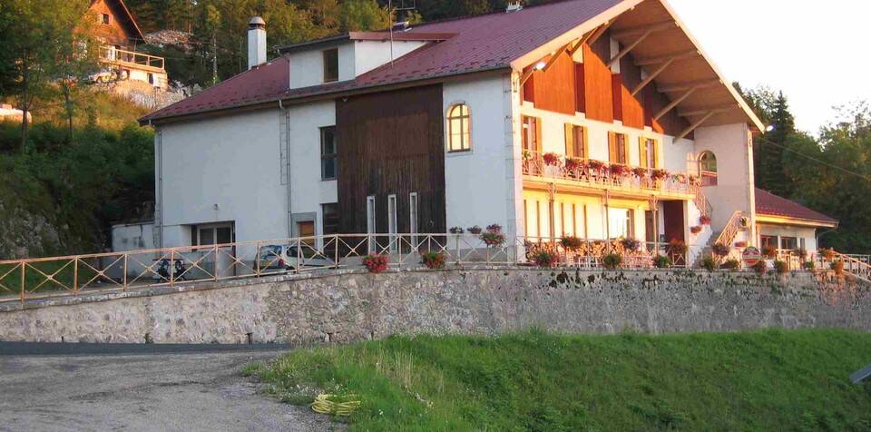 Rdc: salle à manger, salon avec poële à bois, salle de jeux ( baby-foot, ping pong, sono et vidéo projecteur), salle d'activités (séminaire, chant, méditation...). Cuisine équipée. 1er et 2ème étage : 14 chambres de 2 à 8 lits. Sanitaires privatifs et collectifs, lavabos et wc dans chaque chambre. Chauffage central bois. Possibilité de location de 2 grandes salles annexes pour fêtes ou événements (200m² - 60 pers.). Terrasse, parking à proximité. Ski de fond, piste de luge à proximité, promenades en forêt, étang. Lac de Nantua, plateau de Retord. Une étape idéale pour se ressourcer.