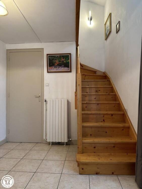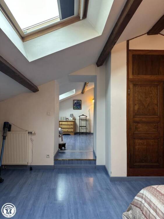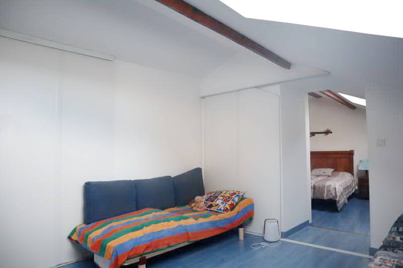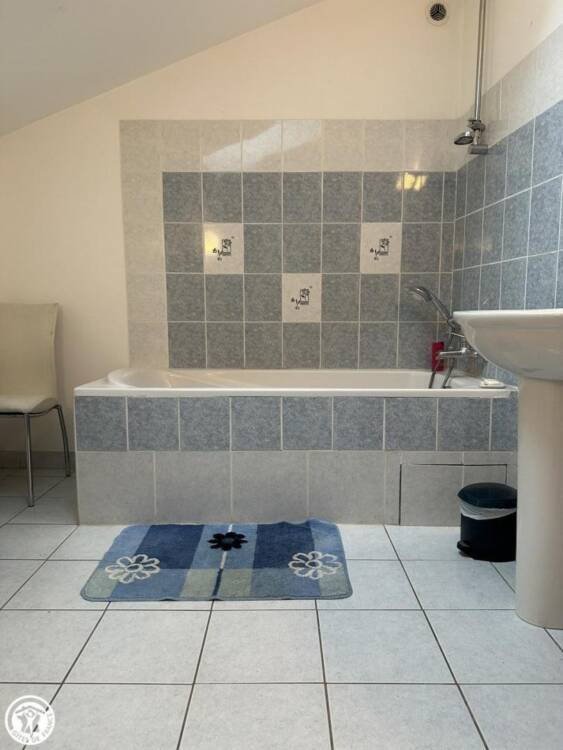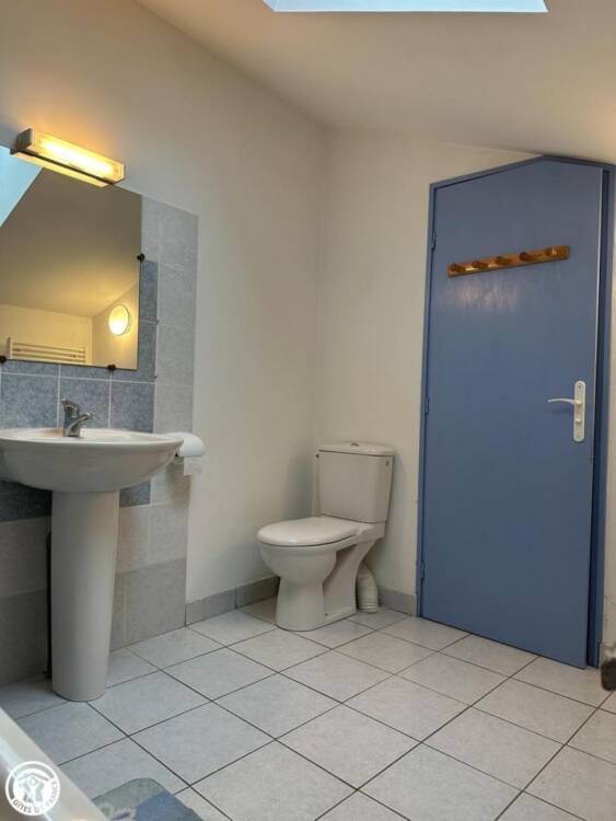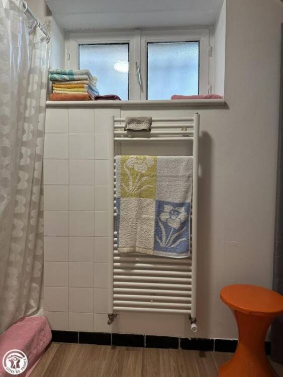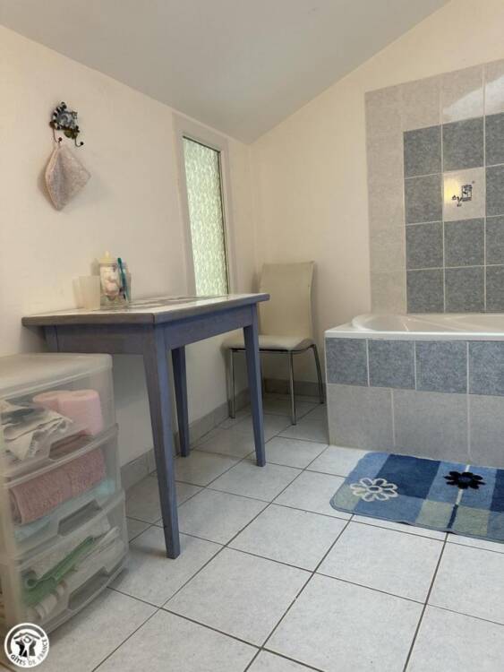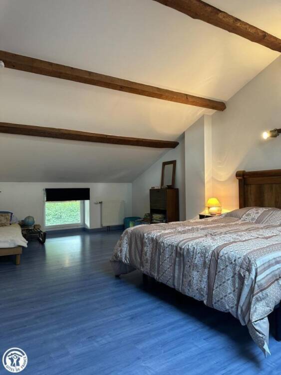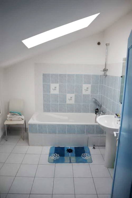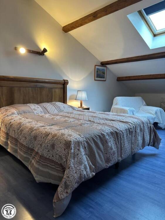 A l'étage, la salle de jeux et de lecture dessert la salle de bain avec baignoire et deux chambres traversantes (dont une grande) équipées d'un lit double chacune.