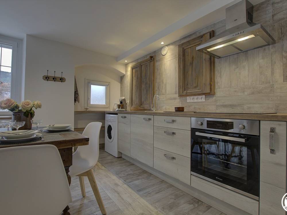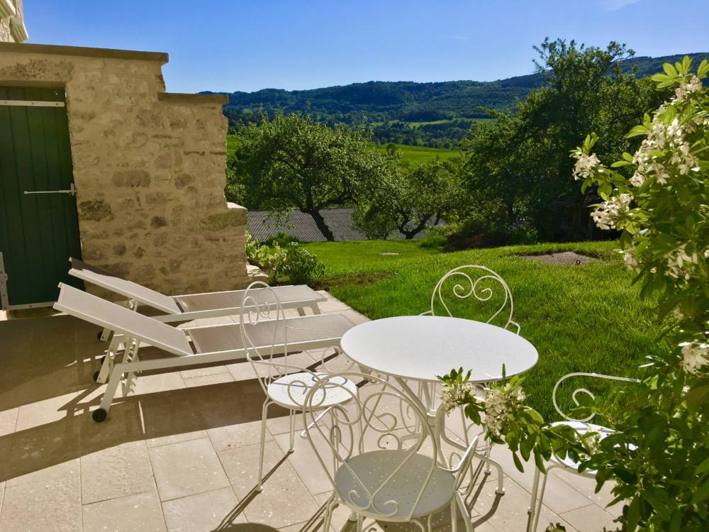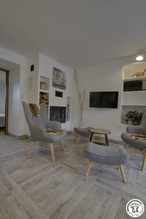 L'entrée se fait depuis la cour d'en haut sécurisée, puis sur le séjour et sa cuisine équipée et ouverte sur un salon où on peut se prélasser devant la cheminée. La chambre avec parquet, équipée d'un bureau en teck, comprend un lit en 160*200 plus un lit pliant couchage régulier en 90*190, donne accès directement sur la terrasse en dalle de pierre avec une vue dégagée sur le verger ; une salle d'eau et son WC. Un second gîte pour 5 personnes est mitoyen pour faciliter les retrouvailles en famille ou entre amis et profiter pleinement du grand verger mis à la disposition des hôtes. La propriété domine une vallée verdoyante où serpente le ruisseau l'Anconnans et la rivière l'Oignin. Les plus du gîte Chez le Tourneur : les lits sont faits à l'arrivée, le linge de toilette fourni et les charges incluses.