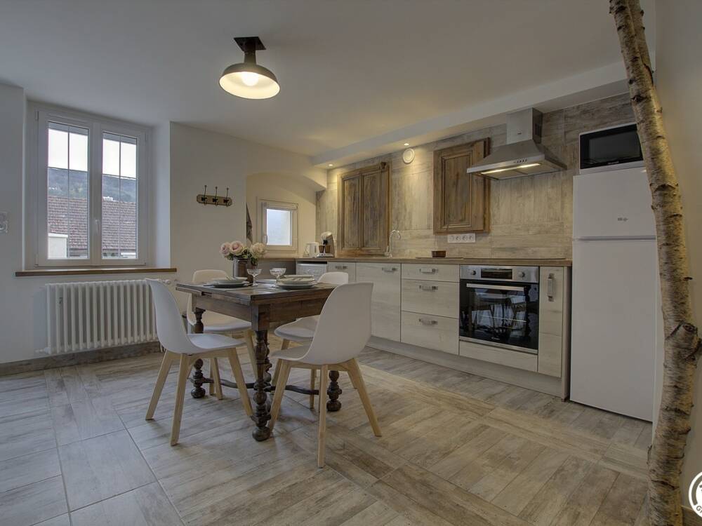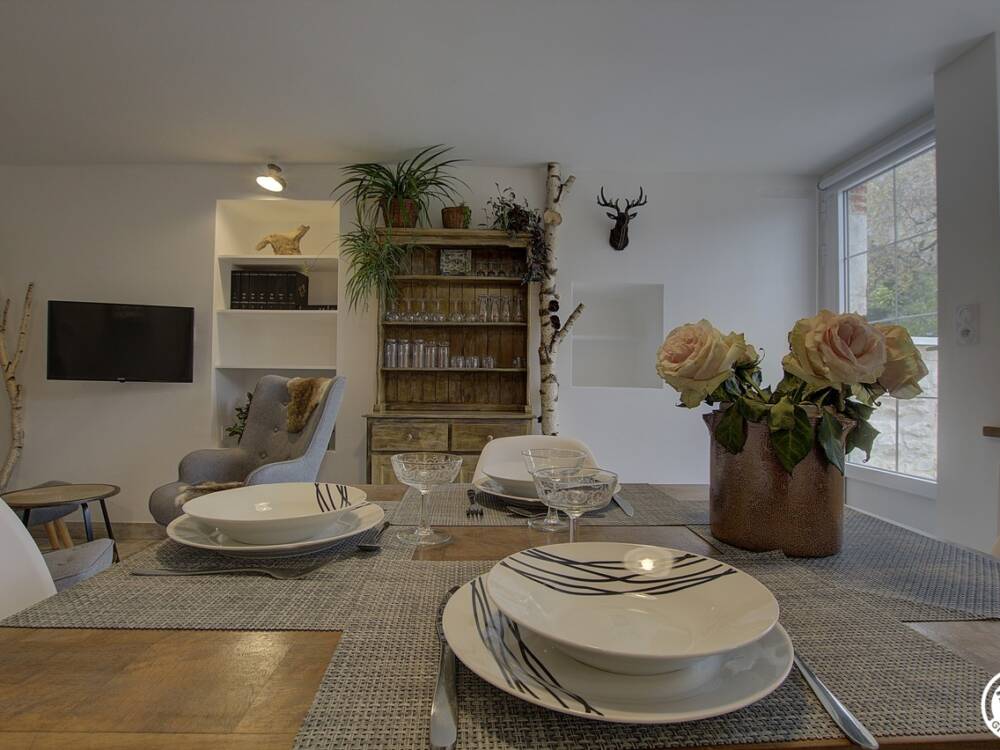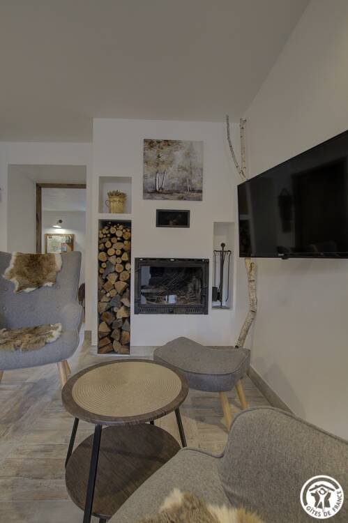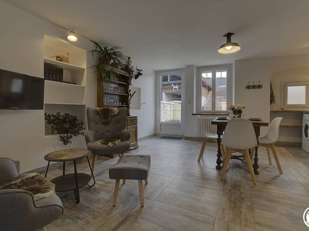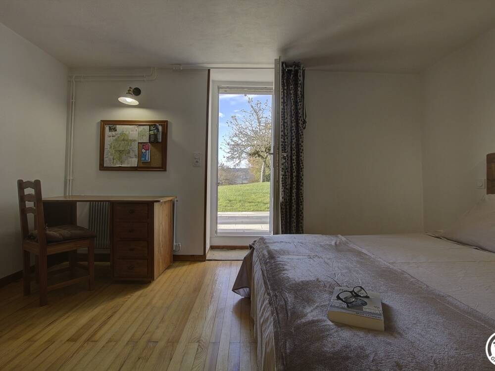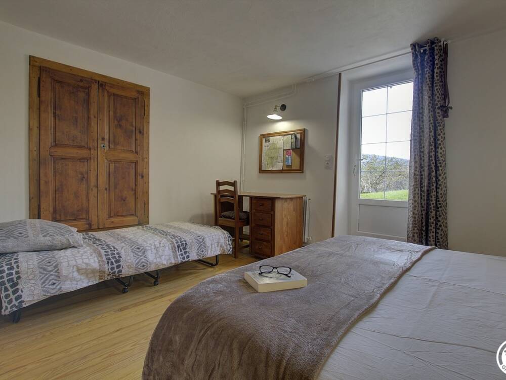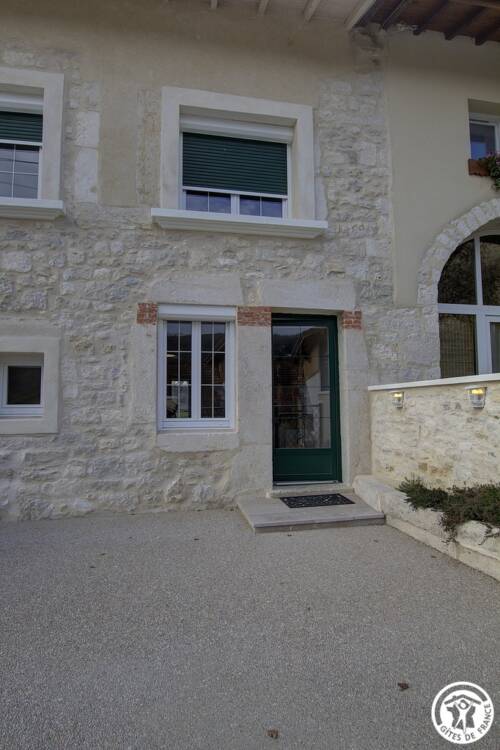 L'entrée se fait depuis la cour d'en haut sécurisée, puis sur le séjour et sa cuisine équipée et ouverte sur un salon où on peut se prélasser devant la cheminée. La chambre avec parquet, équipée d'un bureau en teck, comprend un lit en 160*200 plus un lit pliant couchage régulier en 90*190, donne accès directement sur la terrasse en dalle de pierre avec une vue dégagée sur le verger ; une salle d'eau et son WC. Un second gîte pour 5 personnes est mitoyen pour faciliter les retrouvailles en famille ou entre amis et profiter pleinement du grand verger mis à la disposition des hôtes. La propriété domine une vallée verdoyante où serpente le ruisseau l'Anconnans et la rivière l'Oignin. Les plus du gîte Chez le Tourneur : les lits sont faits à l'arrivée, le linge de toilette fourni et les charges incluses.