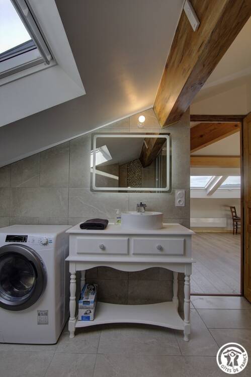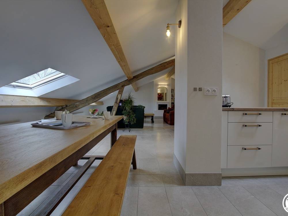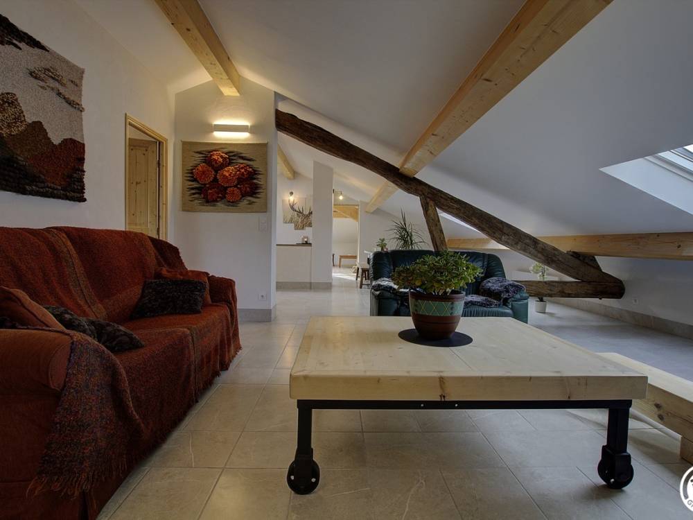 Il peut accueillir jusqu'à 6 personnes, avec ses deux chambres et ses deux sanitaires. Par une entrée commune, vous accédez au 2ème étage de cette belle maison., puis l'entrée se fait directement sur cette grande pièce de vie composée d'une cuisine équipée et ouverte sur l'espace repas suivi dans le prolongement, d'un espace détente avec une cheminée électrique à led à effet feu de bois très réaliste. Vous serez charmé par la charpente et la luminosité grâce à de grands velux avec volets solaires qui vous offrent une vue panoramique sur la vallée. Vous disposez de deux chambres indépendantes :une très grande chambre de 30 m² au sol comprenant deux lits doubles en 160*200 avec possibilité de garder son intimité grâce à sa décoration, le plus de cette chambre : une salle d'eau privative (avec WC et velux). La deuxième chambre (2 lits simples en 90*190) vous mènera dans cette belle forêt, où vous pourrez vous bercer d'une douce lumière. Une deuxième salle d'eau est accessible depuis le séjour et comprends une douche et un WC. Chauffage électrique. Vous apprécierez à votre arrivée que les lits soient faits, le linge de toilette fournis et les charges incluses. Dans la même bâtisse, deux gîtes de 5 et 3 personnes pour des retrouvailles en famille ou entres amis. Louez ensemble, vous disposez alors d'un grand verger pour tous vous retrouver dans un cadre champêtre. Venez découvrir Samognat avec son lac, ses montagnes, sa forêt, les sentiers aux départ du gîte. Site idéal pour de nombreuses balades en VTT ou à pied, jusqu'aux sauts de Charmine ou aux abords des Gorges du val d'Enfer. La propriété domine une vallée verdoyante où serpente le ruisseau l'Anconnans et la rivière l'Oignin.