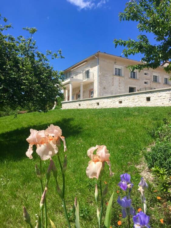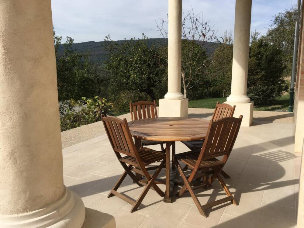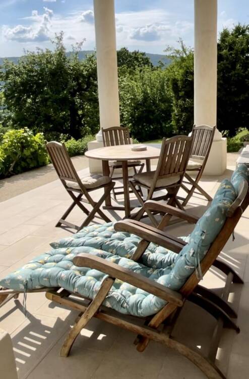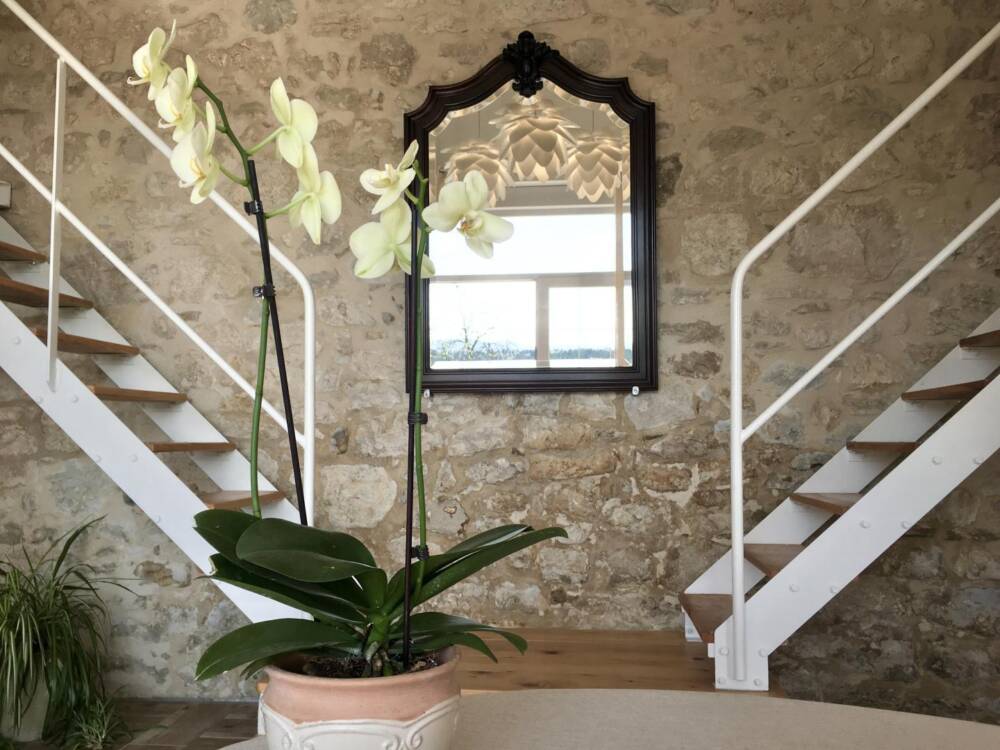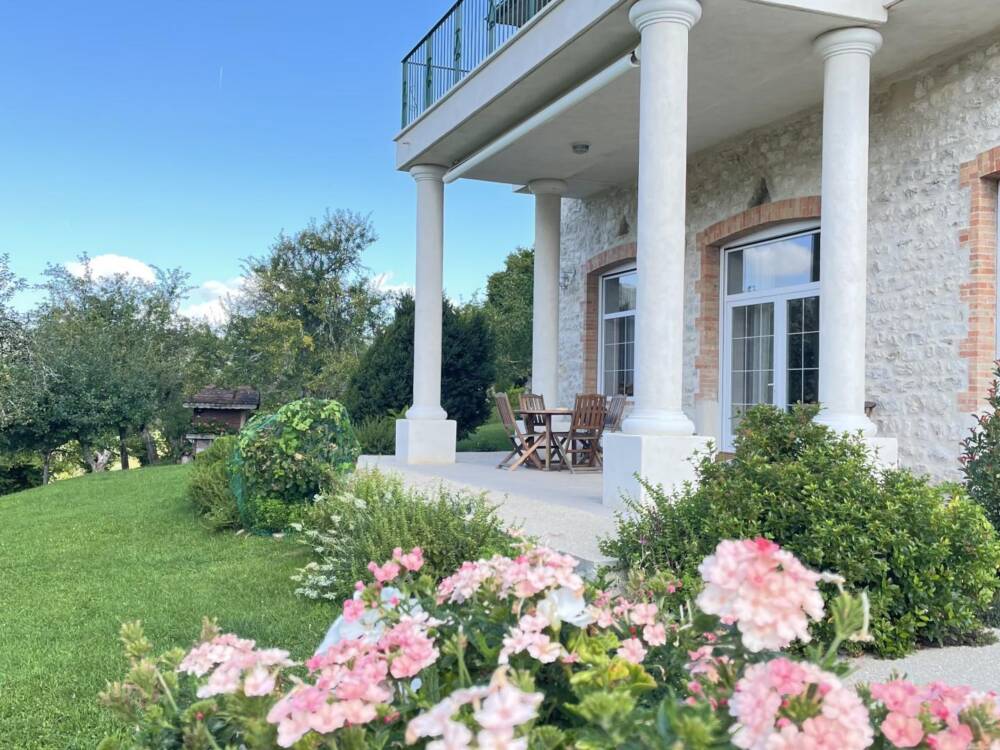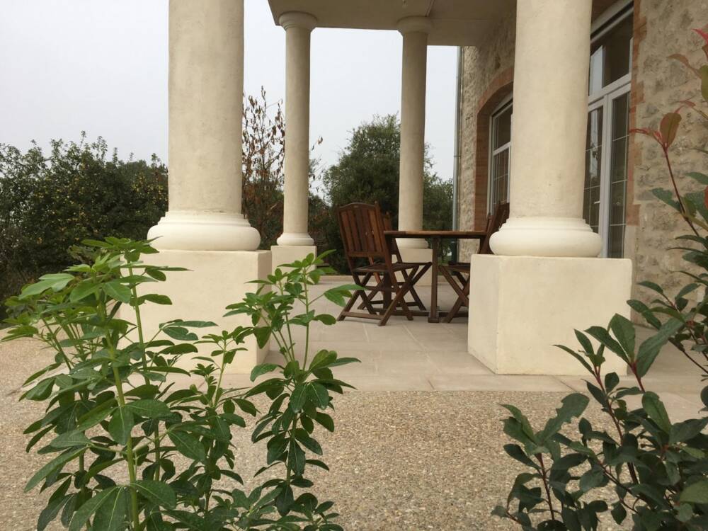 L'entrée se fait depuis la cour privative du bas puis sur la terrasse couverte de 50 m² où s'imposent 4 grandes colonnes devant une magnifique façade en pierres apparentes.