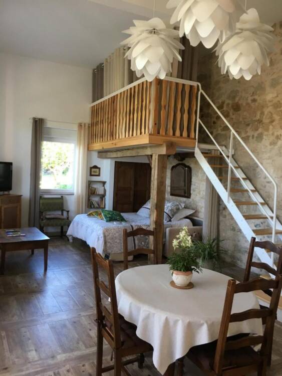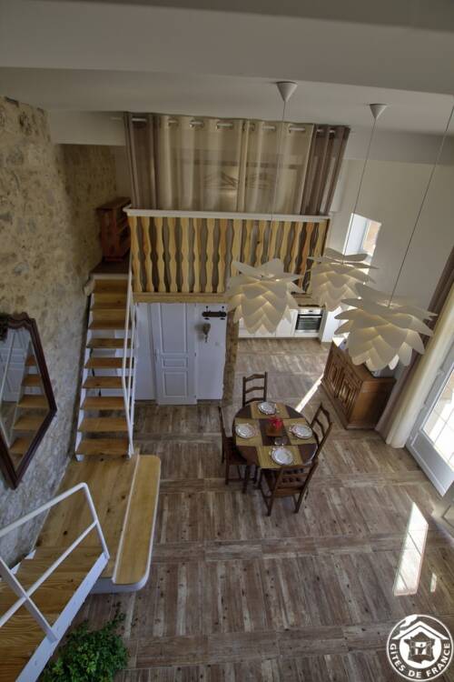Par une entrée indépendante, ce loft très lumineux mélange le charme du bois, de la pierre, son sol trompe l'œil et une décoration épurée et chaleureuse. Une entrée sur la cuisine équipée, ouverte sur le séjour et son espace salon disposant d'un canapé lit (couchage régulier en 160). Un escalier se sépare pour proposer 2 mezzanines : une petite mezzanine avec un lit en 90*190 et une mezzanine avec un lit en 160. Une salle d'eau avec douche à l'italienne et un WC indépendant.